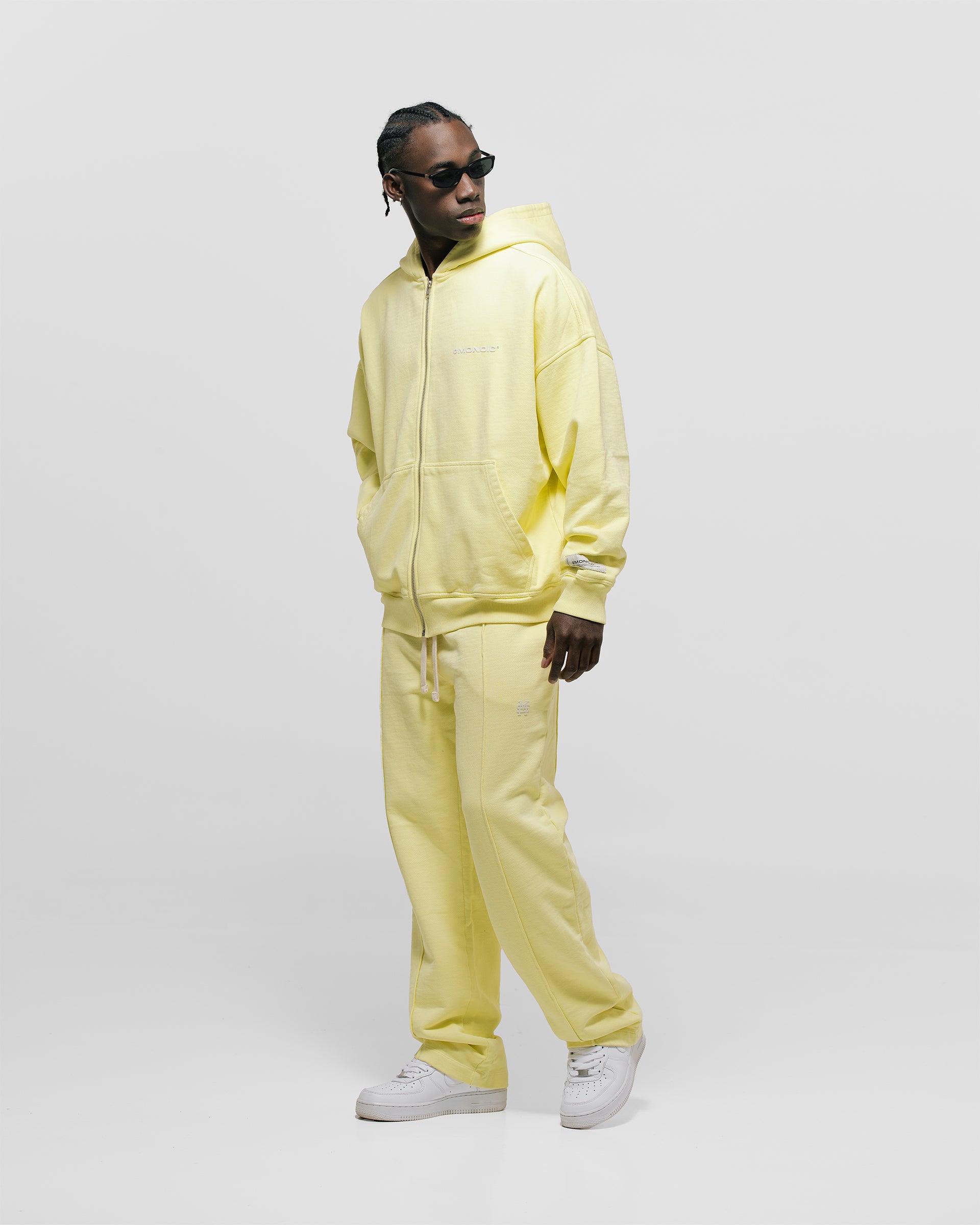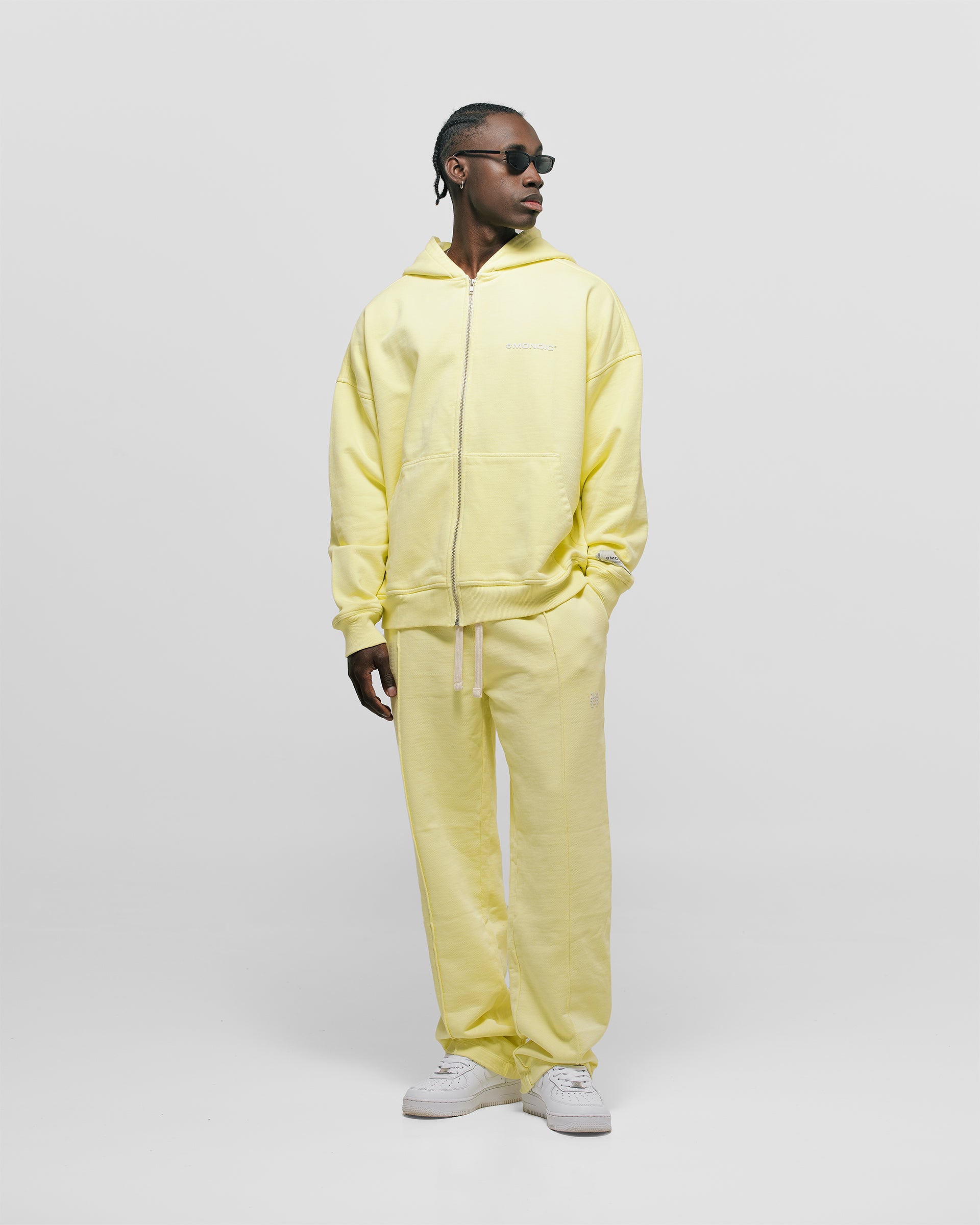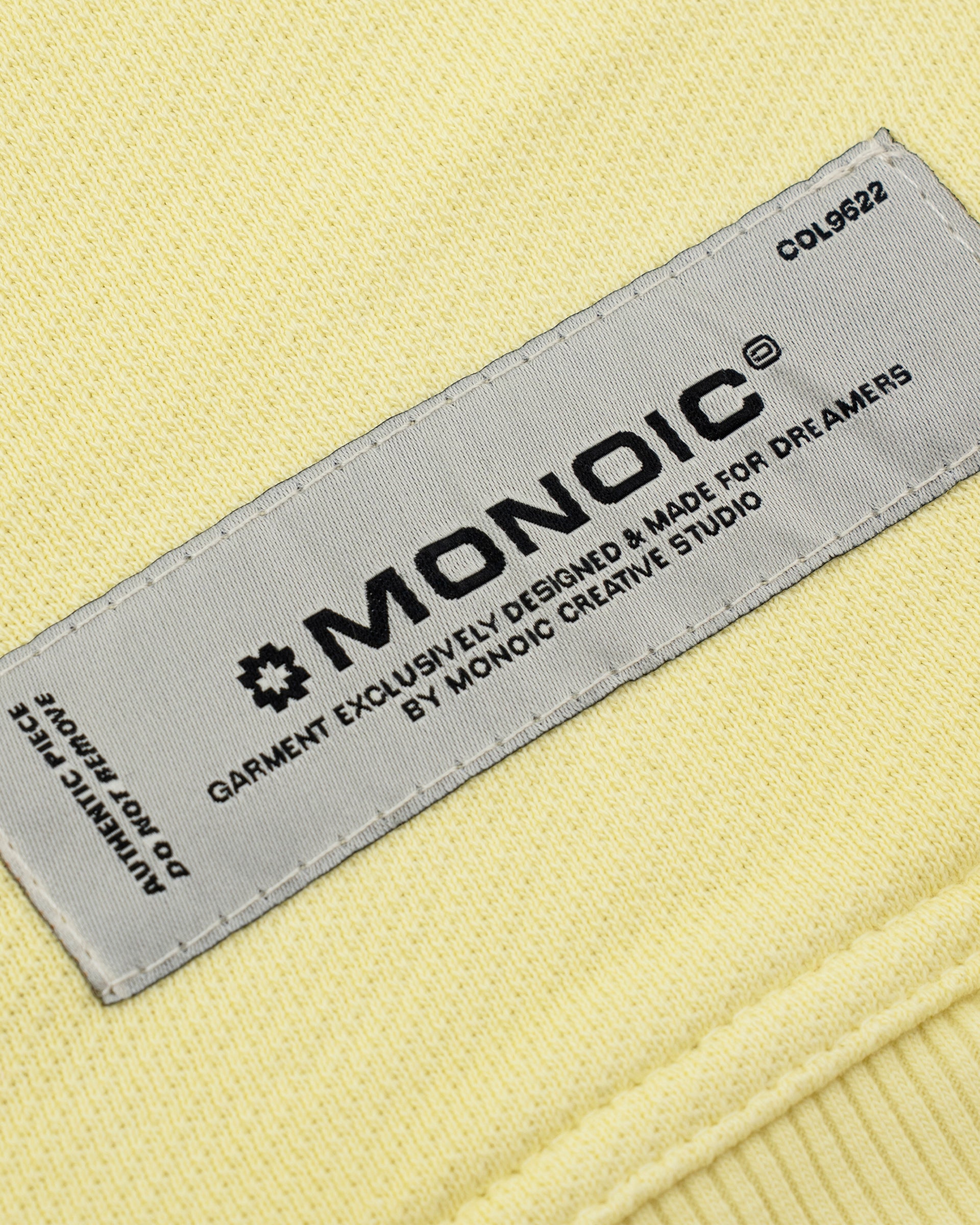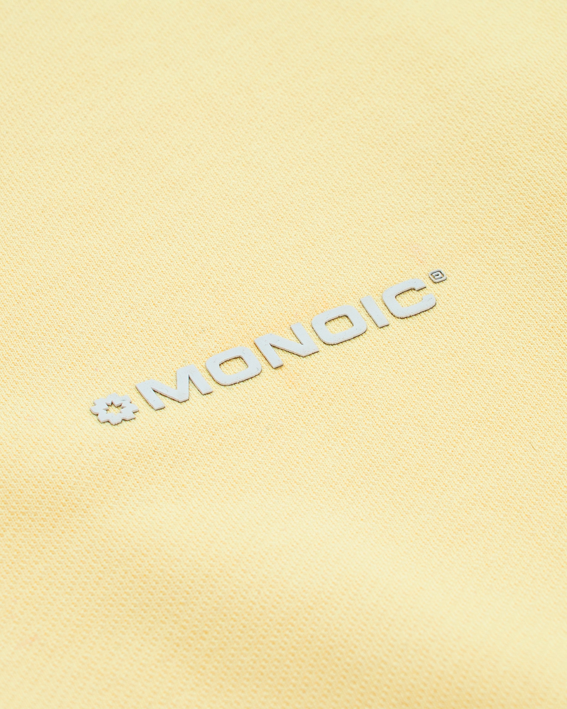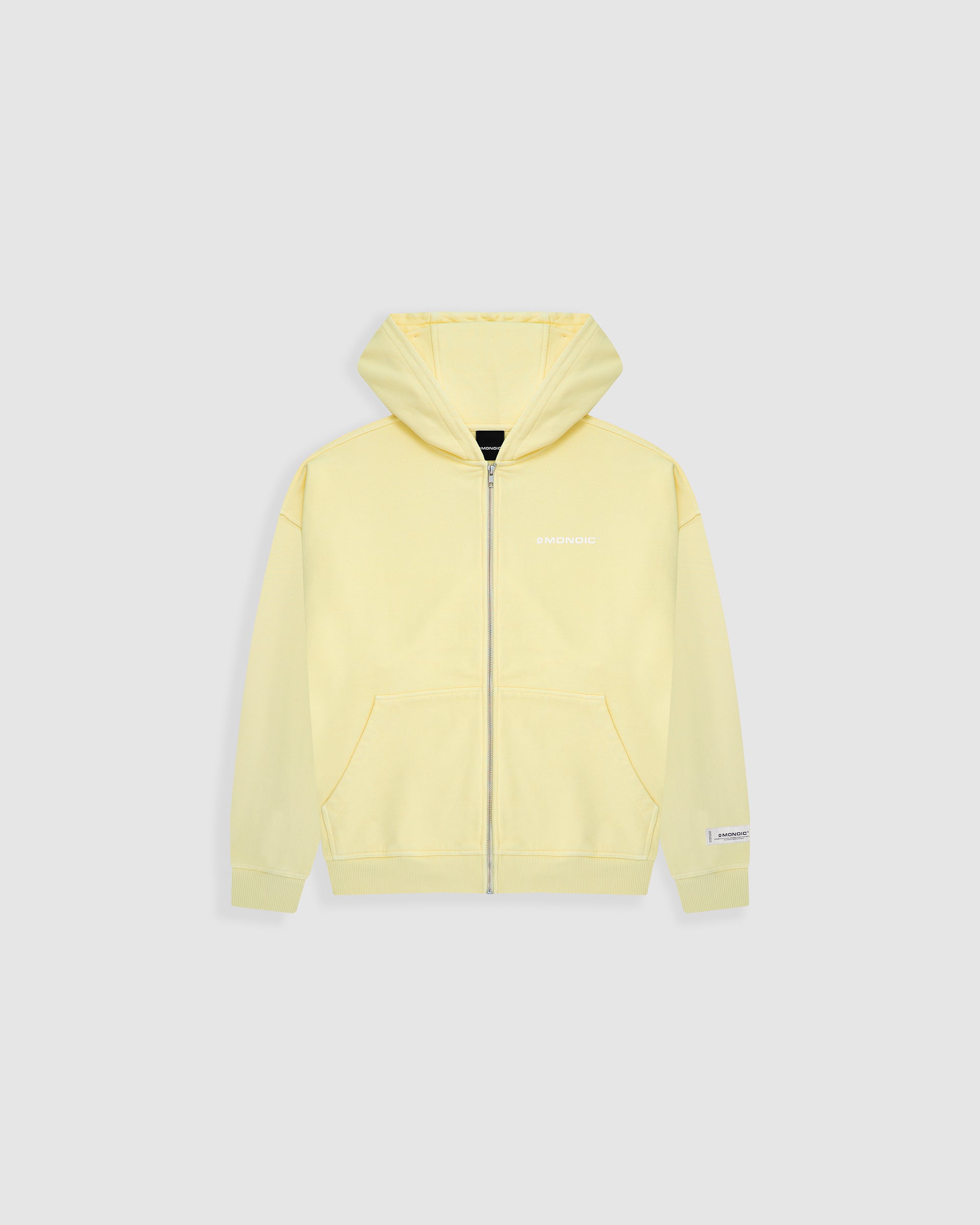Basic Oversized Zip Hoodie V3 in Yellow, made from heavyweight 100% cotton (400 gsm). Pre-shrunk and garment-dyed for a premium finish. Front YKK #5 zipper, side pockets, hood, and ribbed cuffs/hem. “Monoic” logo screen-printed on the left chest.