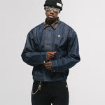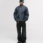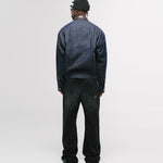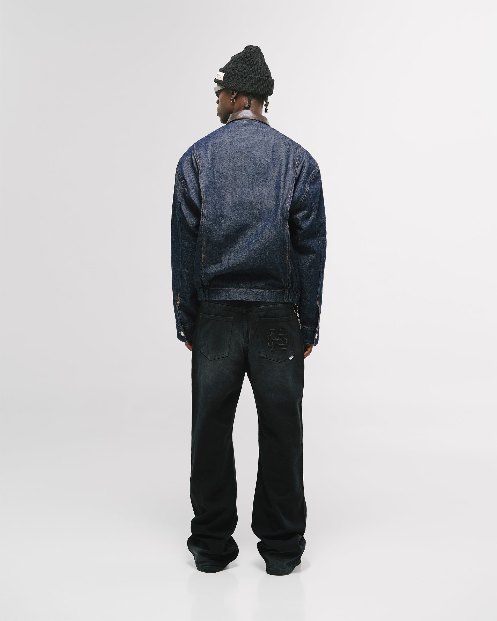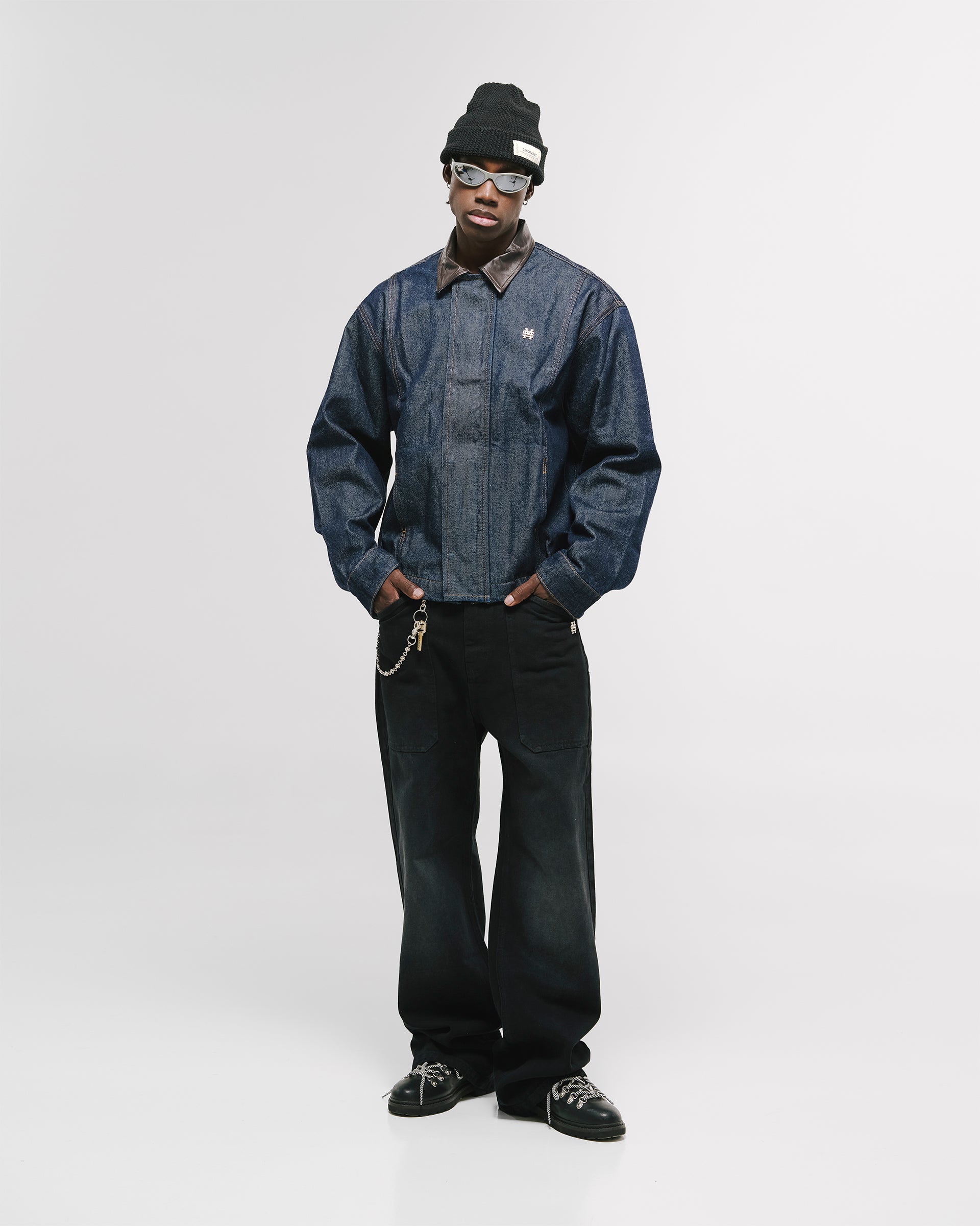 The Aviator Denim Jacket in raw denim — made from 100% cotton with a leather collar for a sharp, sophisticated contrast. It's a new drop, so check the size guide before you buy. Features a front zipper, two side pockets and a metallic MONOIC monogram on the left chest.