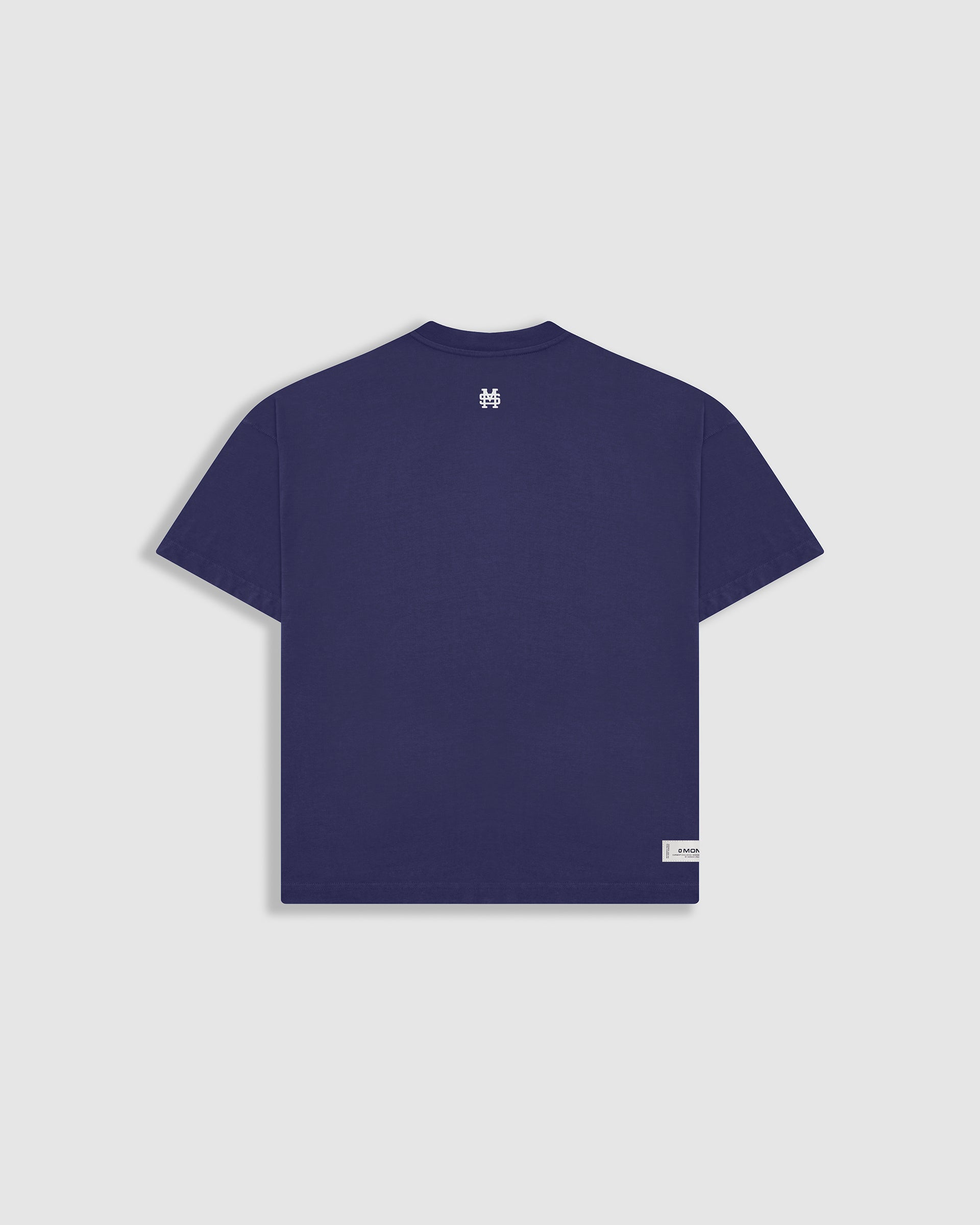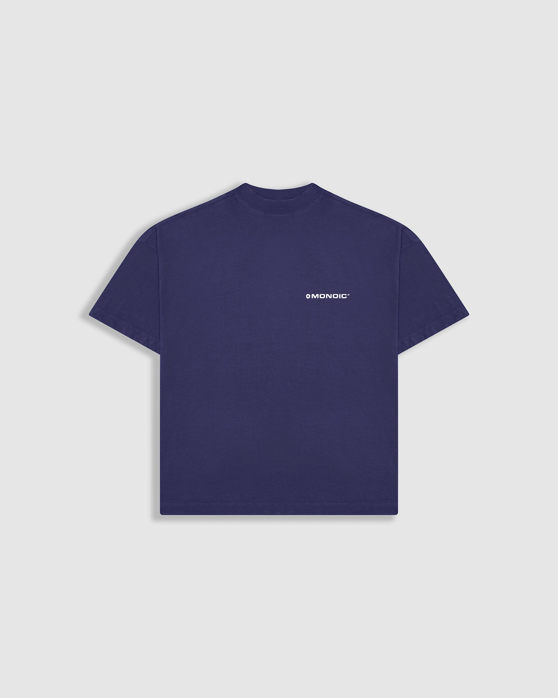 Boxy Fit T-shirt in Skipper Blue (blue-violet tone), crafted from premium 100% cotton jersey, heavyweight (250 gsm). Ribbed crew neck. MONOIC logo in puff (3D) screenprint on the left chest and a raised monogram centered at the back neck. Made in Colombia.