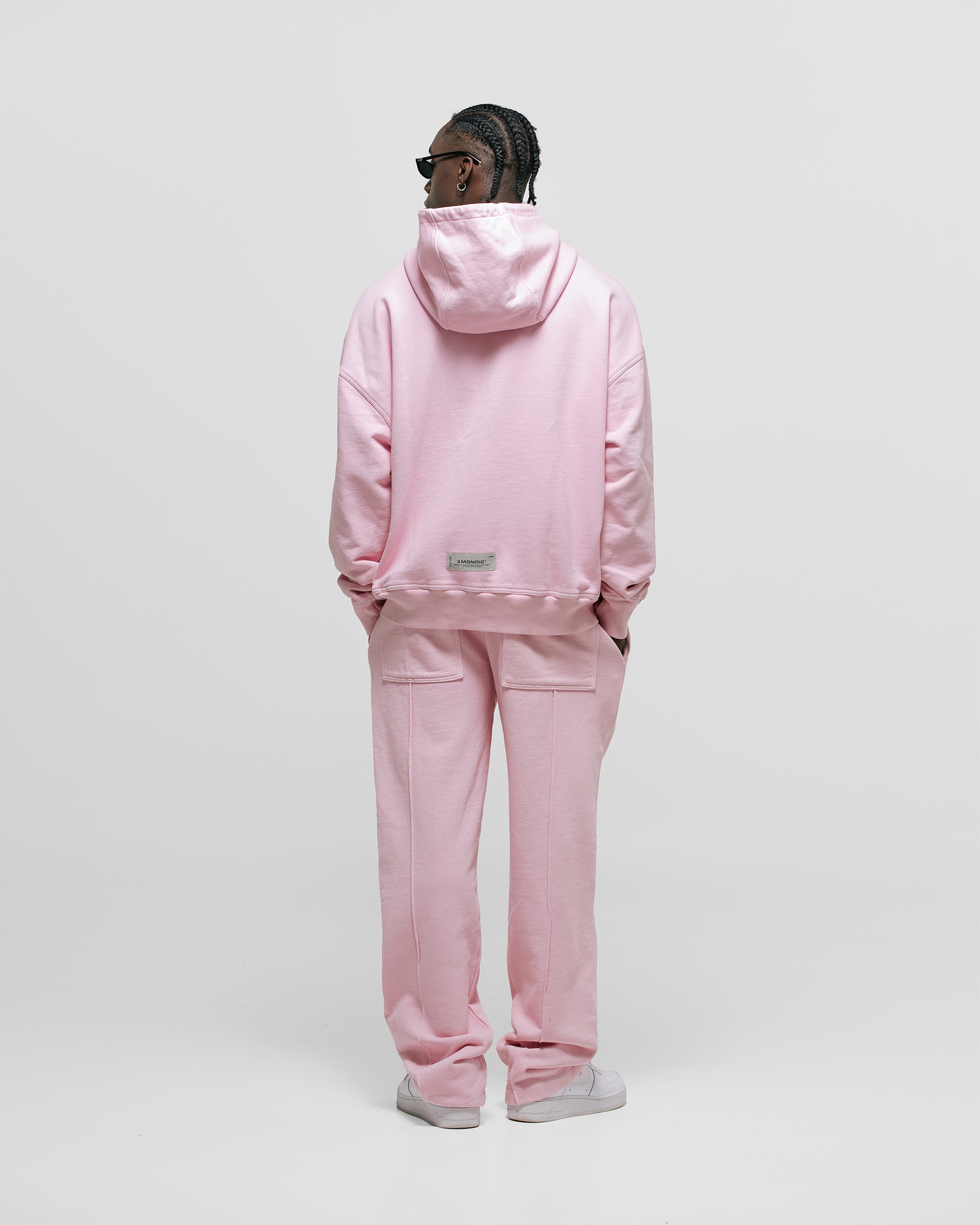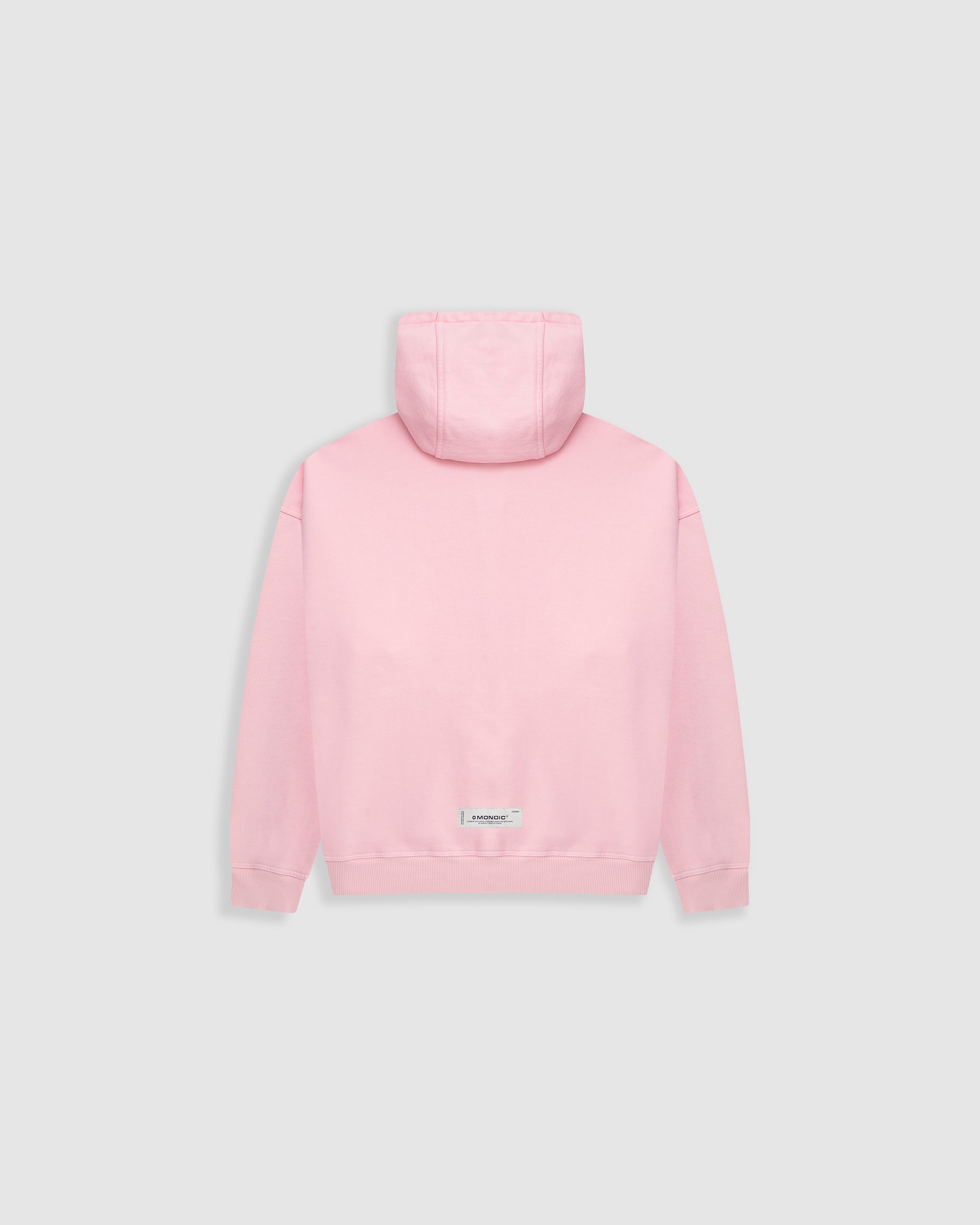 Basic Oversized Hoodie V3 in Pastel Pink, heavyweight 100% cotton (400 gsm). Pre-shrunk and garment-dyed. Features a hood, kangaroo pocket, ribbed cuffs and hem, and a left-chest “Monoic” puff (3D) screenprint logo.