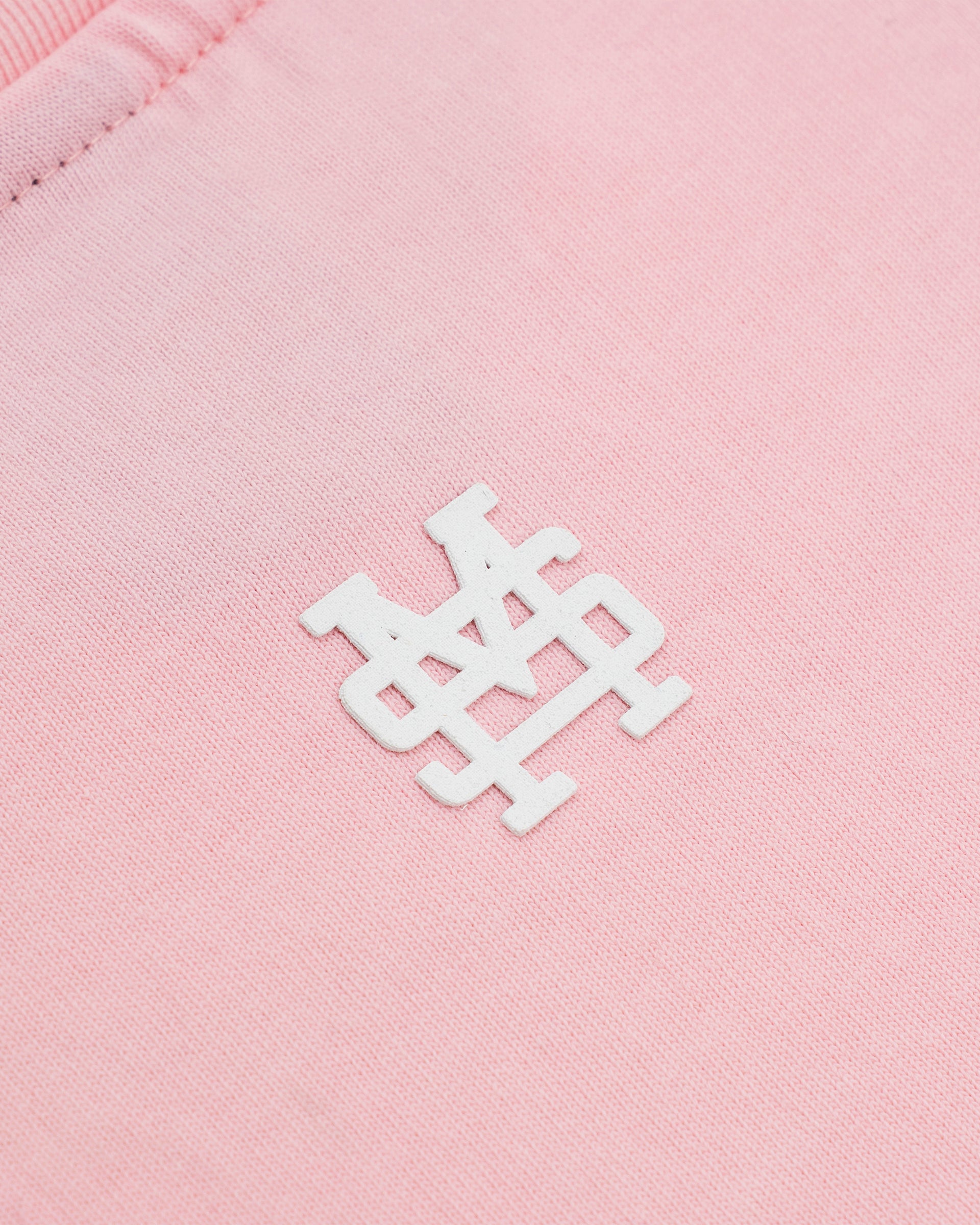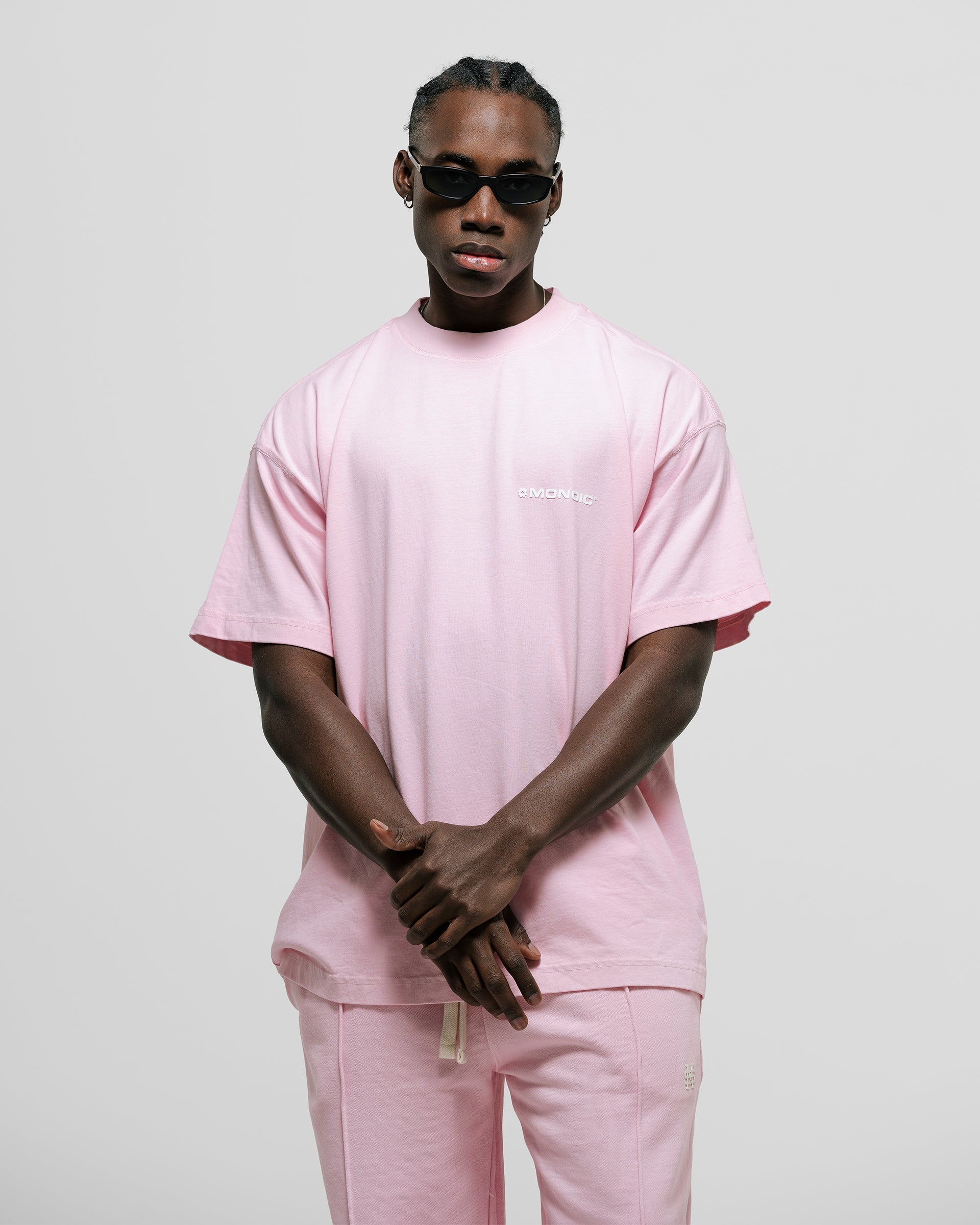 Oversized T-shirt in Pastel Pink, crafted from premium 100% cotton jersey, heavy-weight (250 gsm). Ribbed crew neck. MONOIC logo in puff (3D) screenprint on the left chest and a raised monogram centered at the back neck. Made in Colombia.