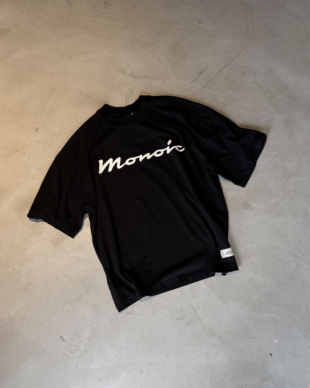 Boxy Fit T-shirt in Jet Black, crafted from 100% heavyweight cotton. Screen-printed graphics: MONOIC star on the back and centered “Monoic” on the chest. Ribbed crew neck and woven MONOIC side label.