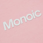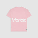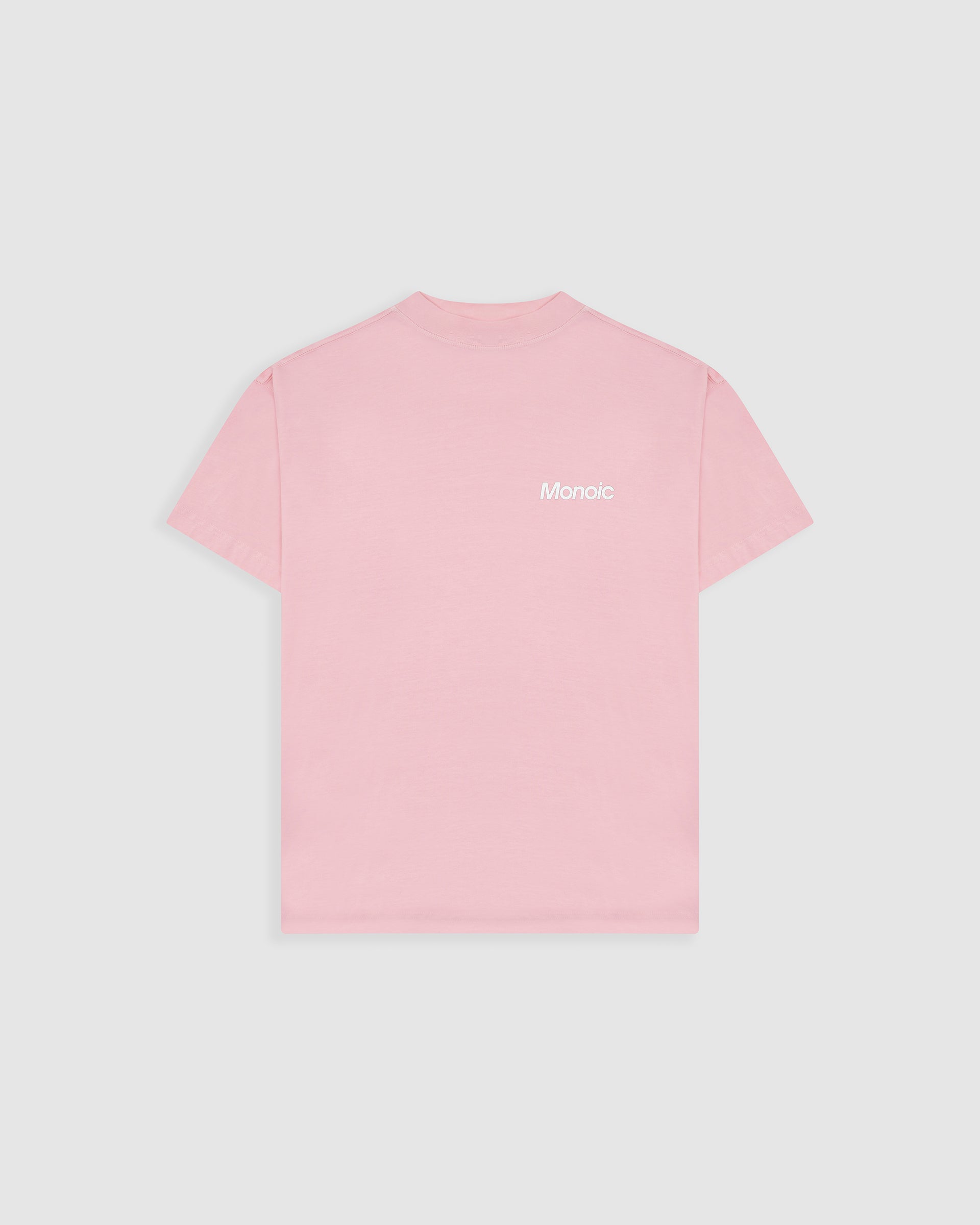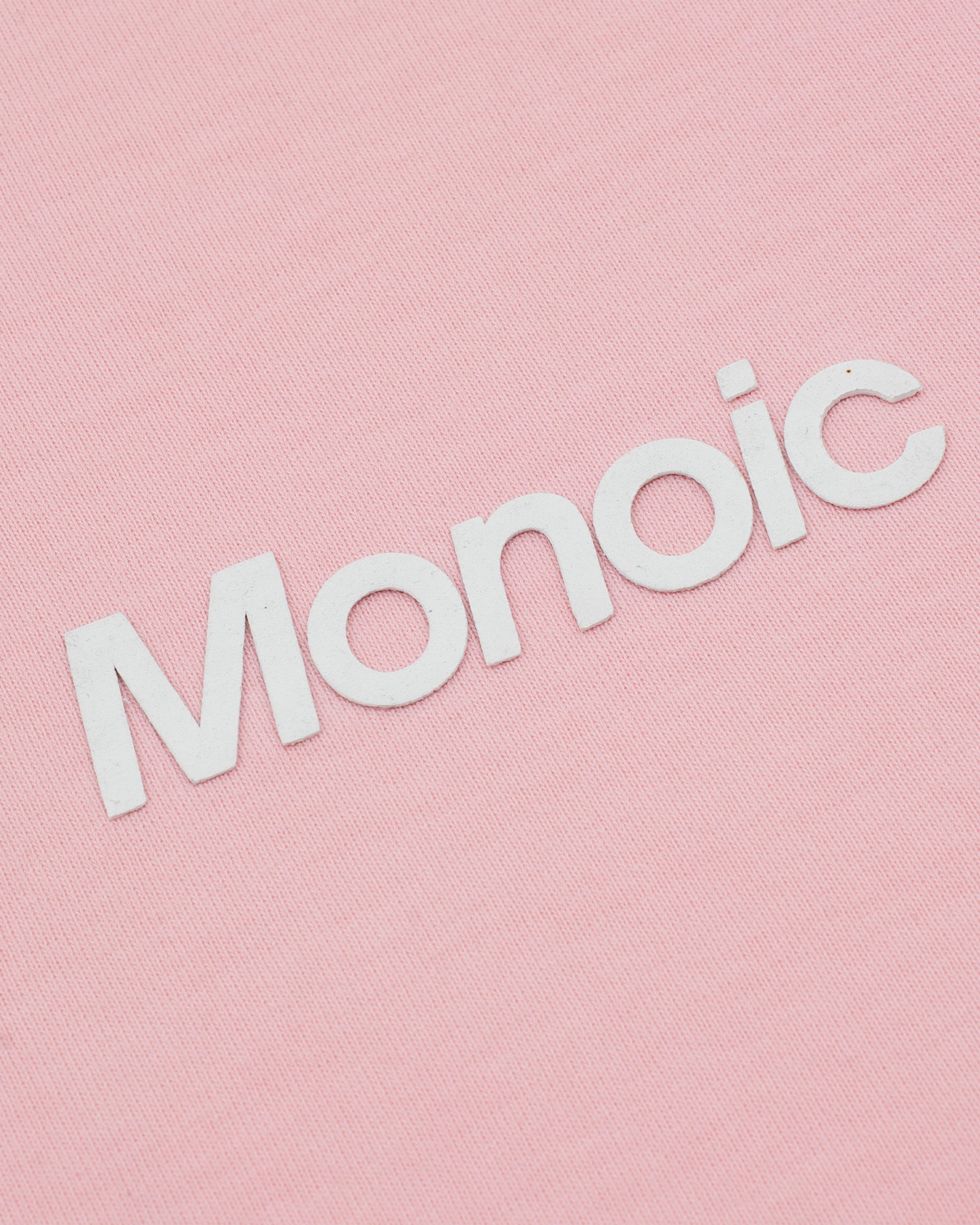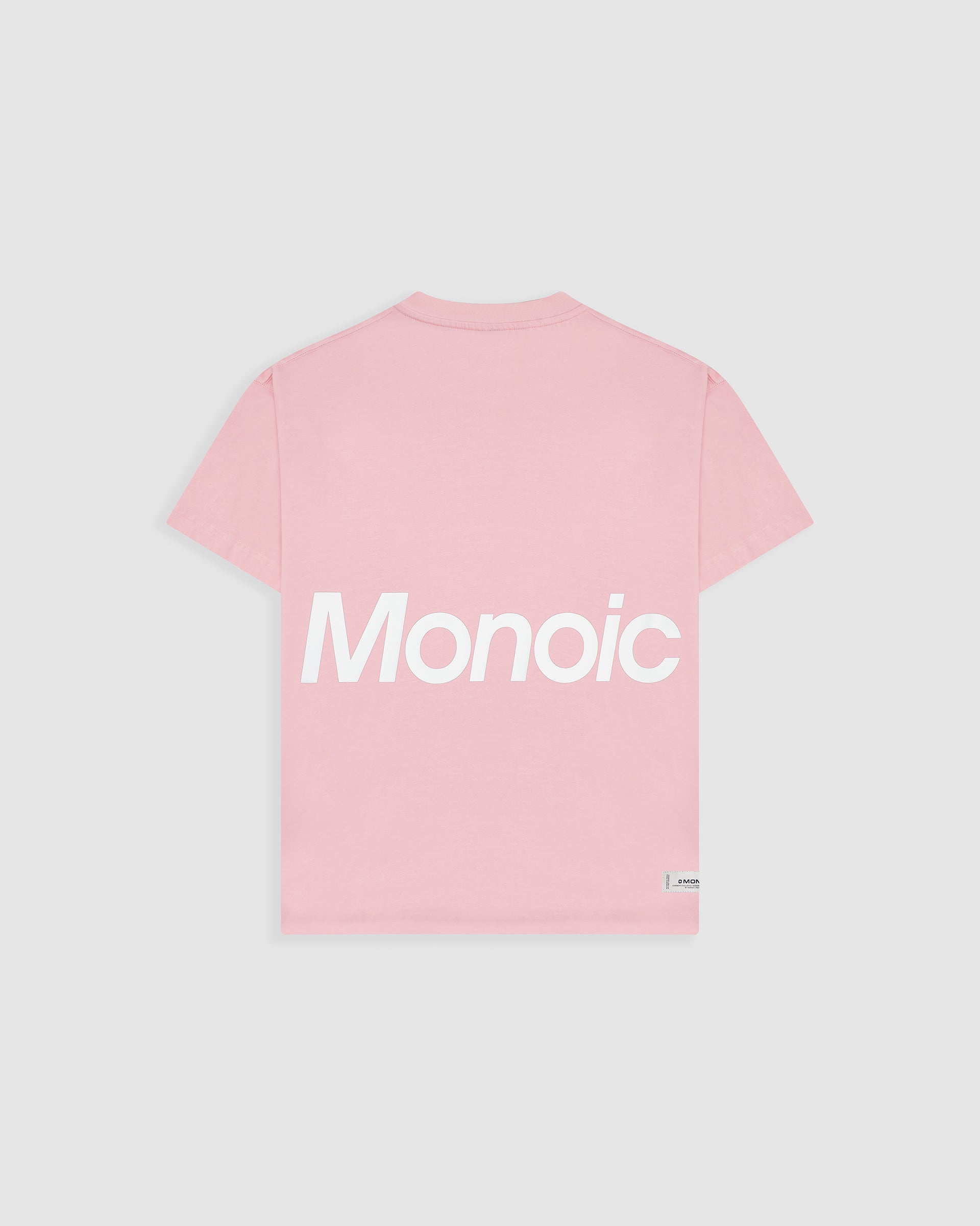 Short-sleeve T-shirt in Pastel Pink with an oversized fit, crafted from premium heavyweight 100% cotton jersey (250 gsm). Ribbed crewneck and a “Monoic” logo screenprint on the back. Made in Colombia.