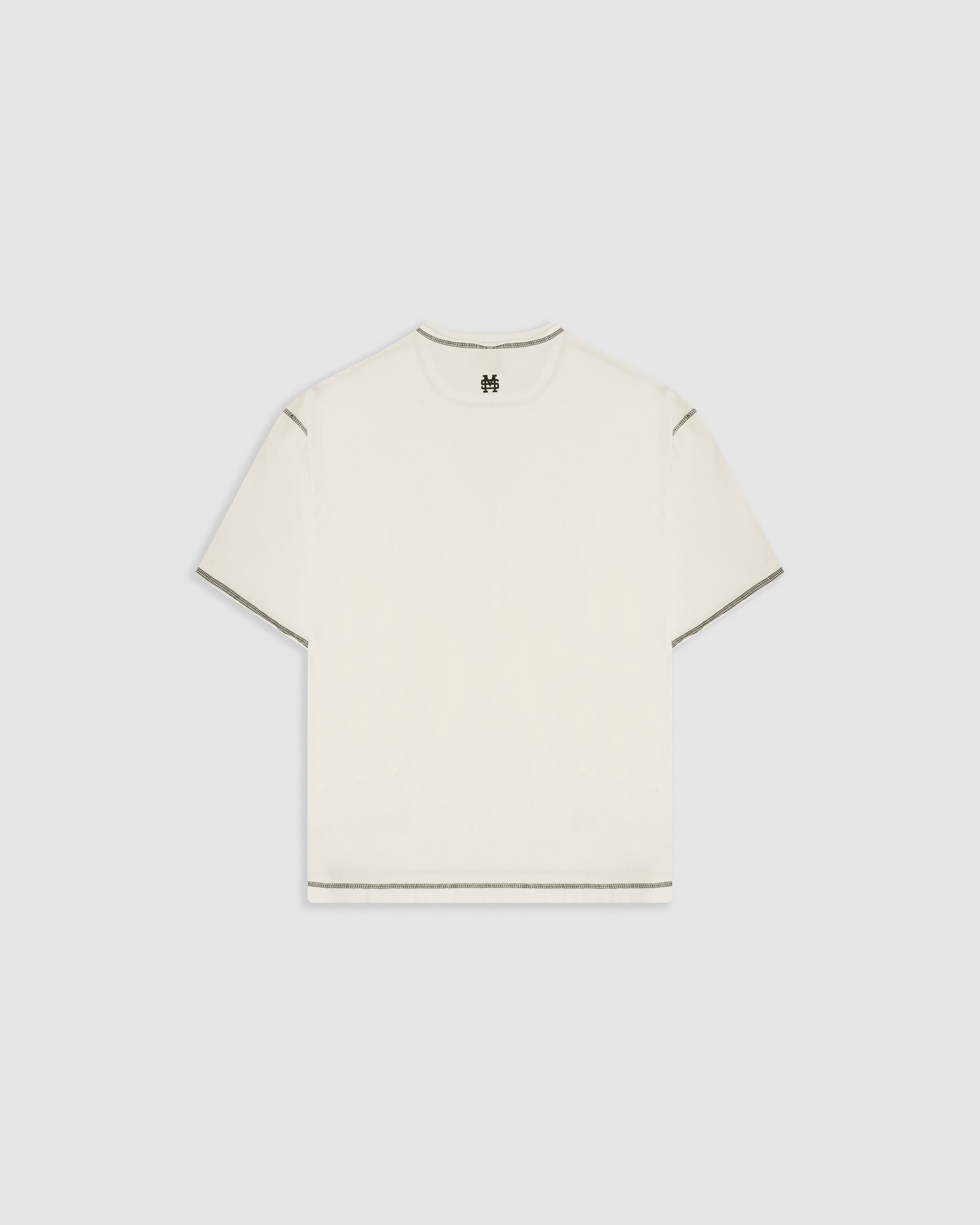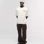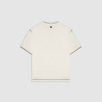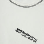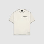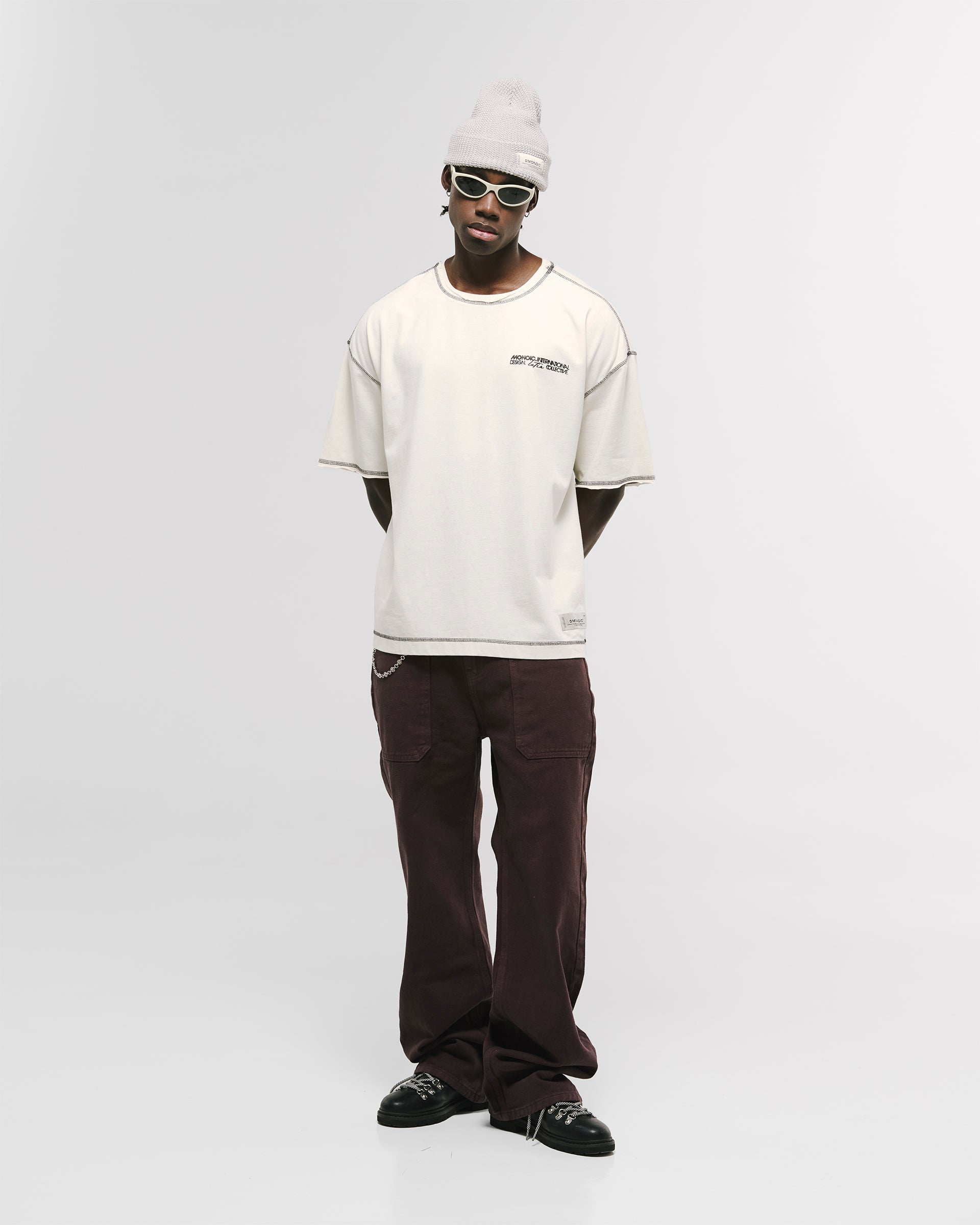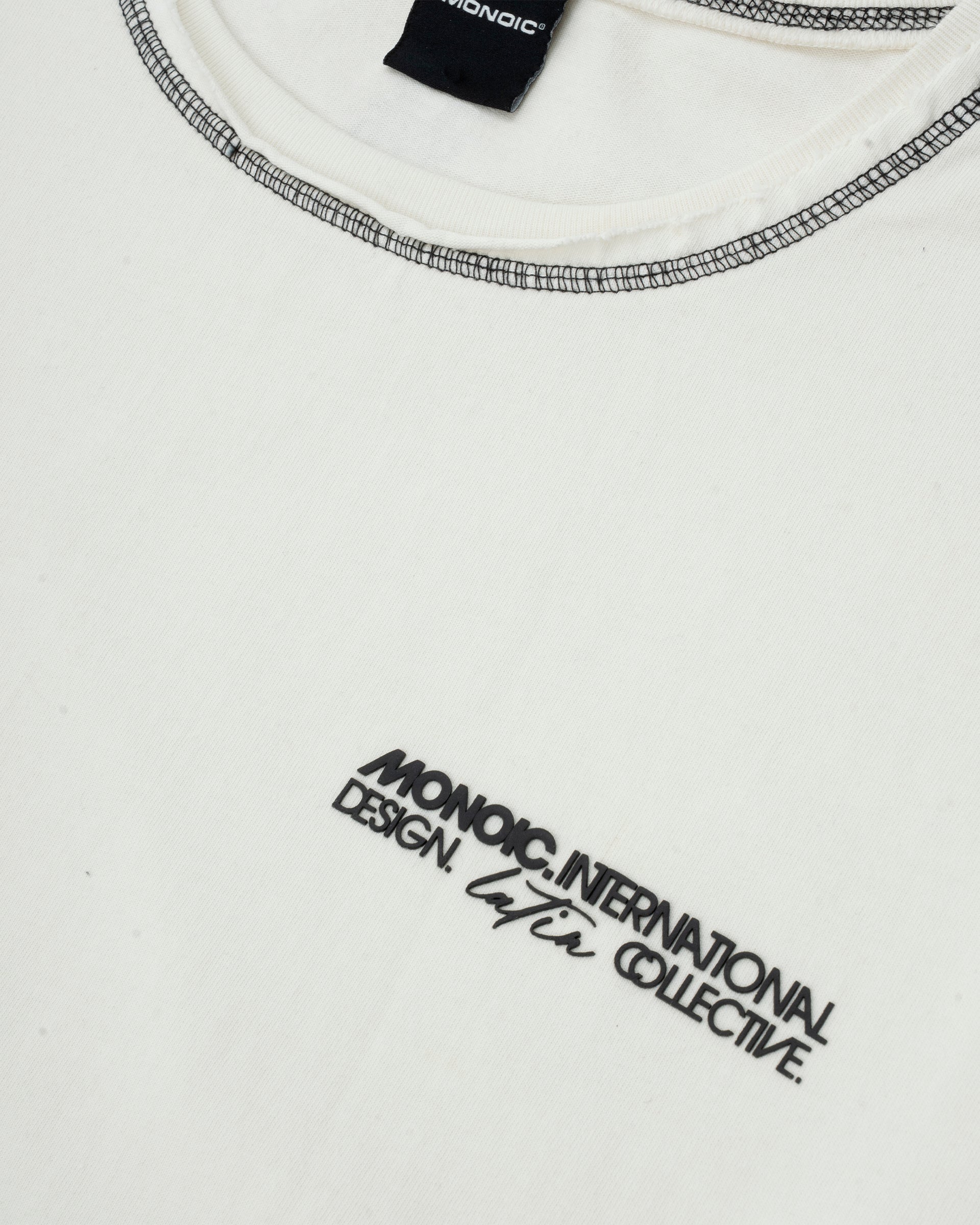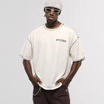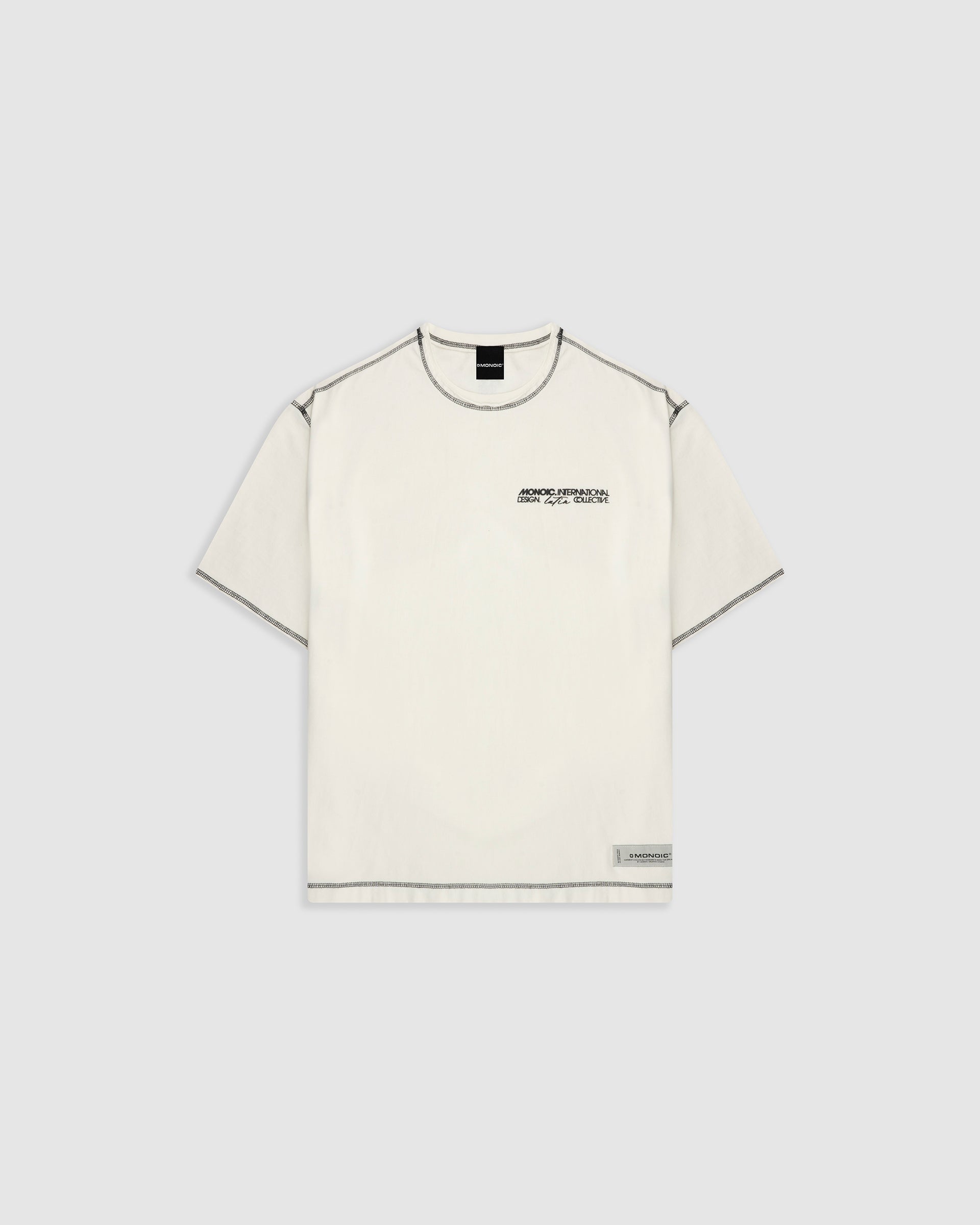 Design Collective Boxy Fit T-Shirt in Off-White, crafted from 100% heavyweight cotton (250 gsm). New boxy fit: roomier with dropped shoulders. Contrast stitching and distressed finishes: raw/open hems at neck, sleeves, and waist for a lived-in look. Left-chest (heart position) 3D screenprint and MONOIC woven label at the left waist. Made in Colombia.