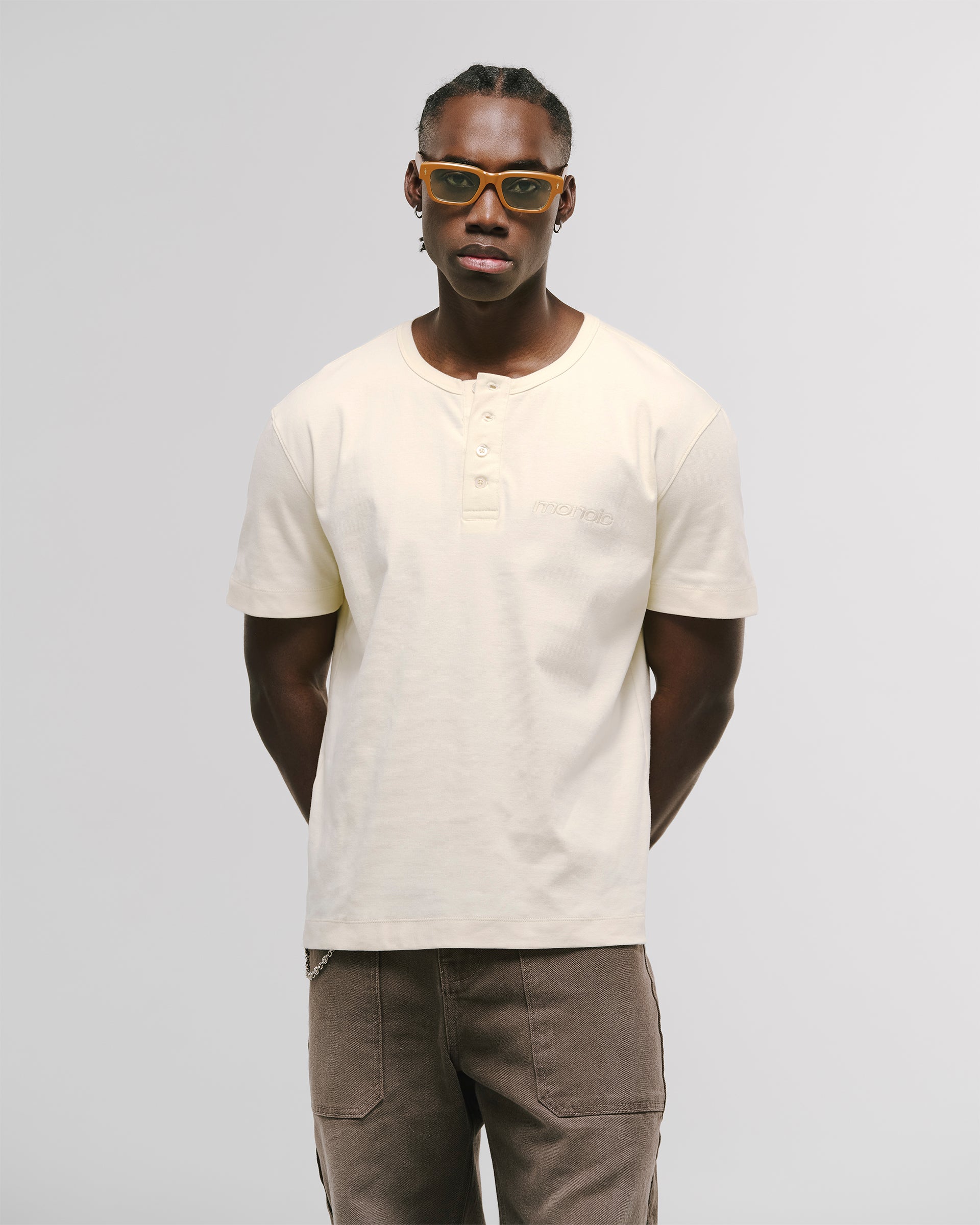 Henley tee in 100% cotton rib with a 4-button placket. Regular fit (for a closer fit, go one size down). “Monoic” embroidered at left chest and a centered back-neck monogram embroidery. Made in Colombia.